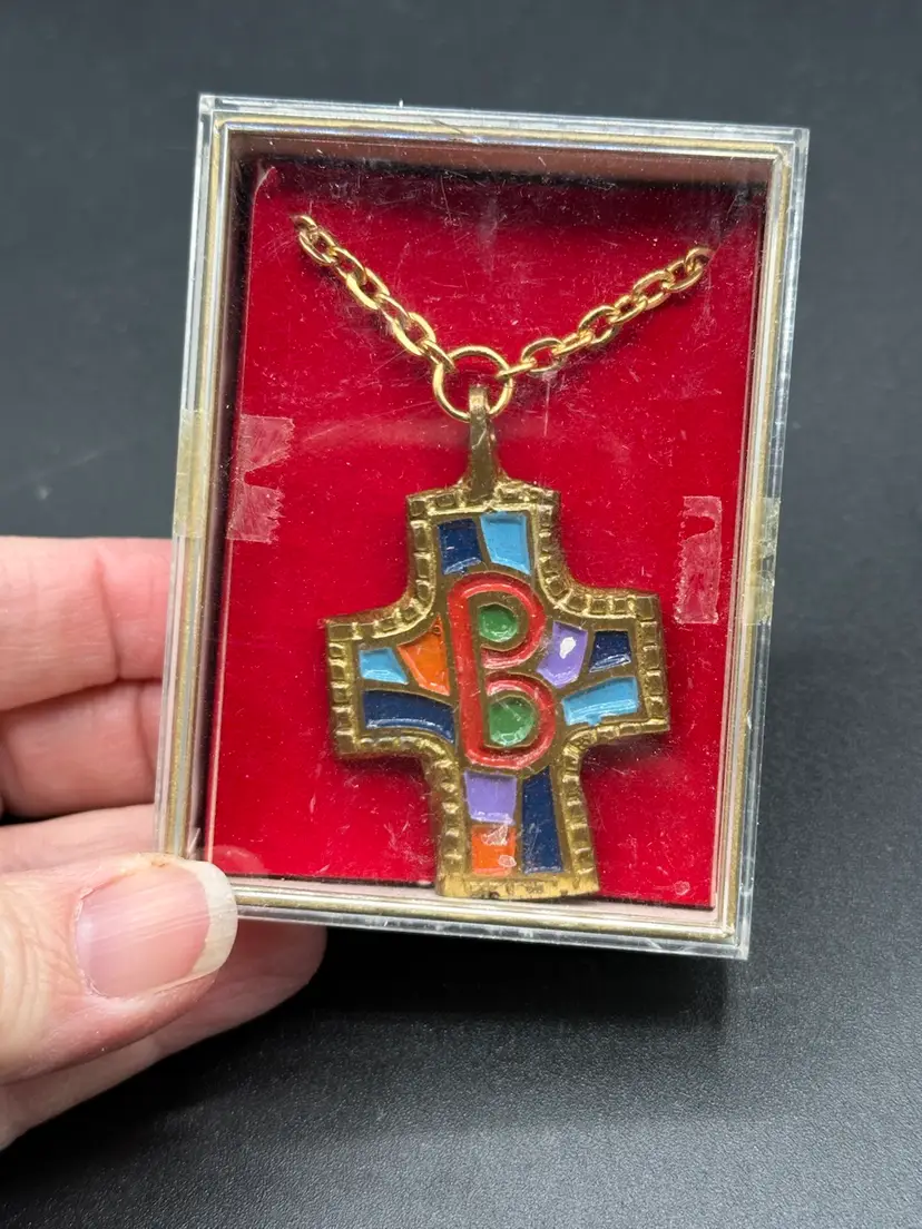 VTG 1971 Israel Terra Sancta Guild Brass & Multicolor Enamel Cross Pendant