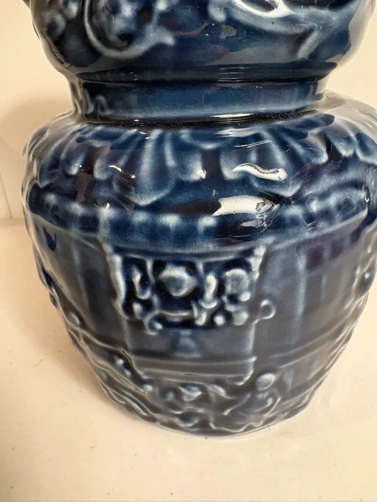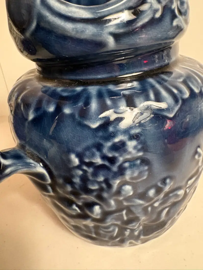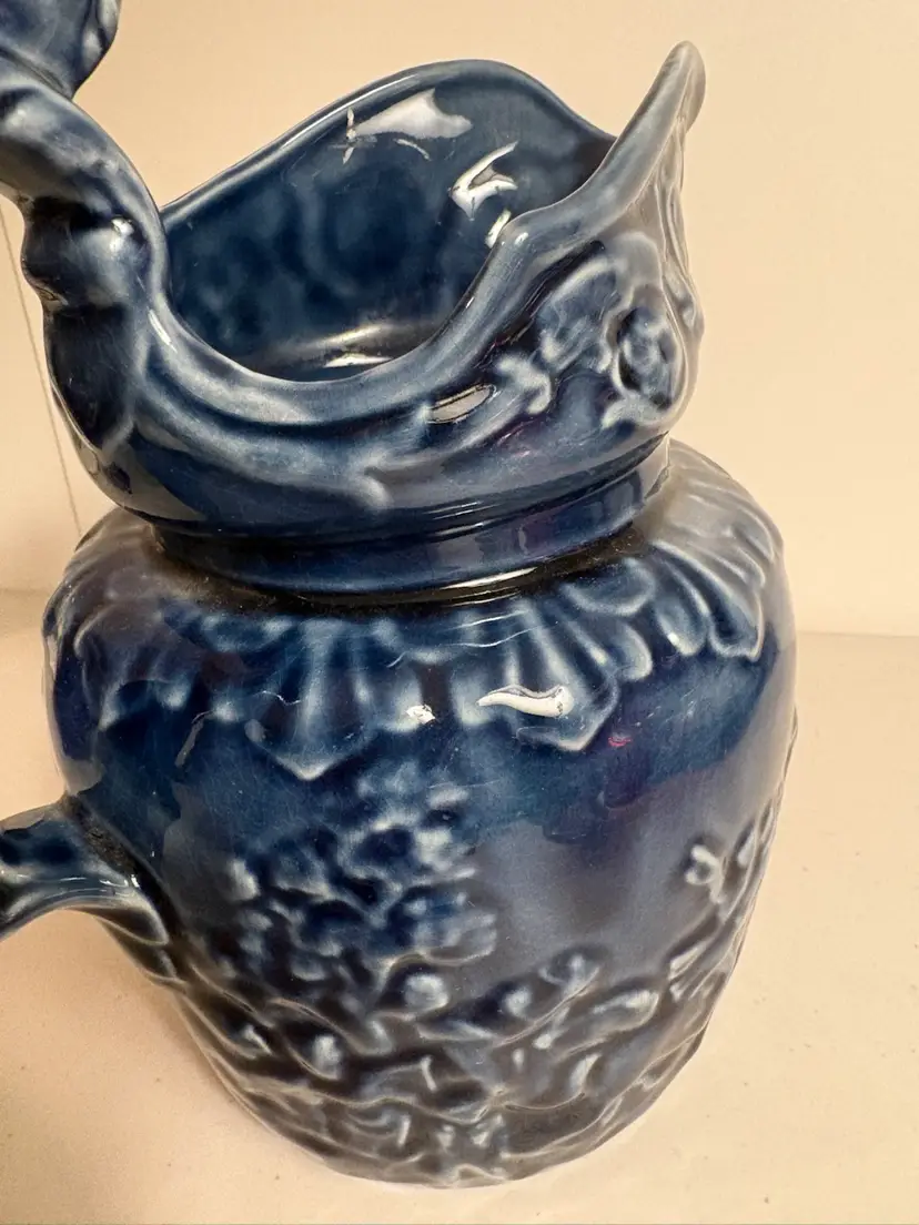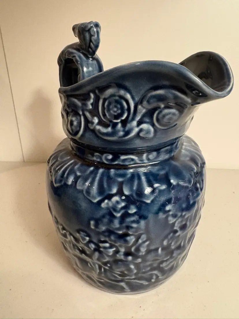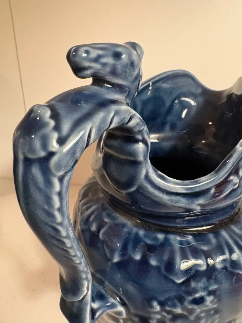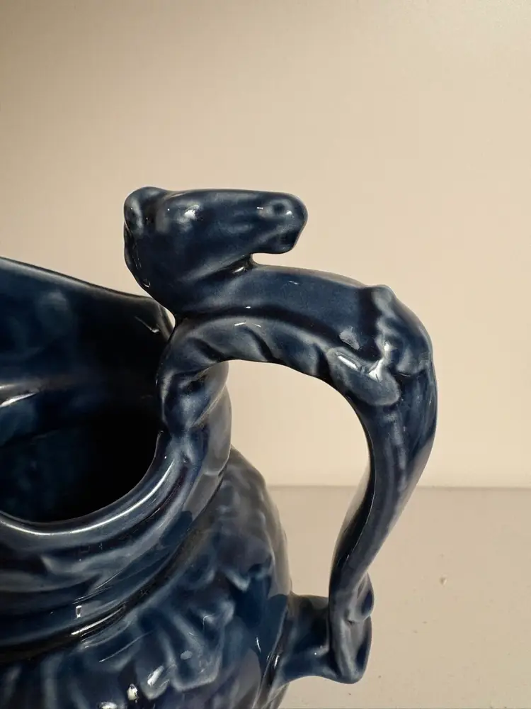 The Vtg Arthur Wood Blue Ceramic Relief Pitcher with a Horse Handle is a vintage piece of art pottery produced in England. This decorative pitcher features a glossy blue finish and a unique horse handle design, making it a charming addition to any tea and coffee set. With its original production style and technique, this Arthur Wood pitcher showcases the craftsmanship and artistic flair of British pottery. Made in the United Kingdom, this vintage pitcher is a collectible item that will surely be a conversation starter in any home.