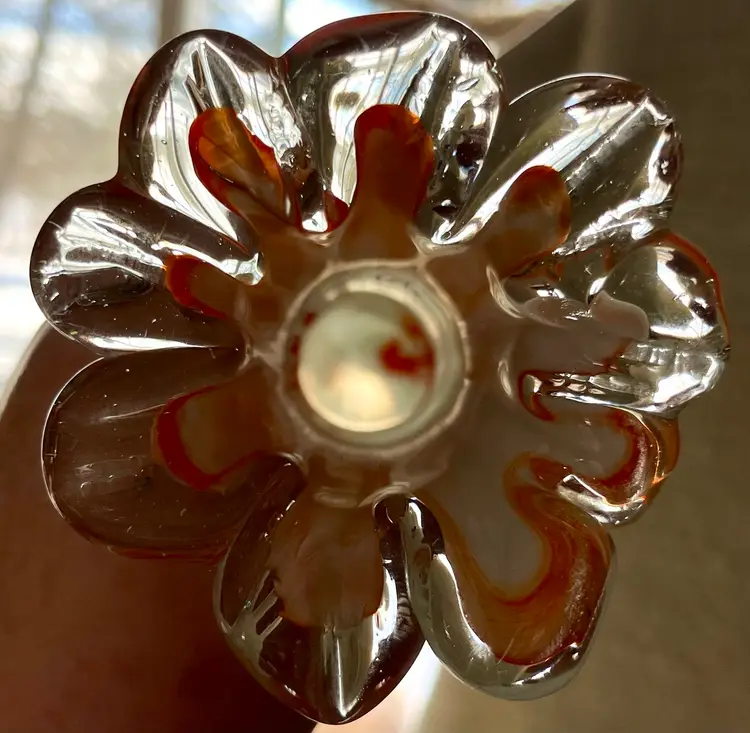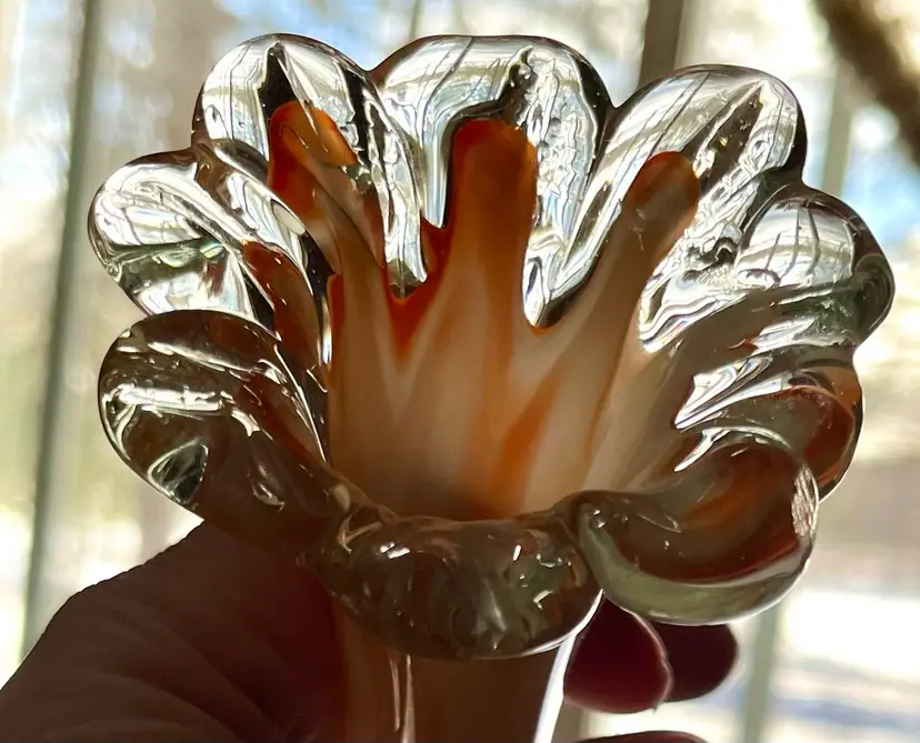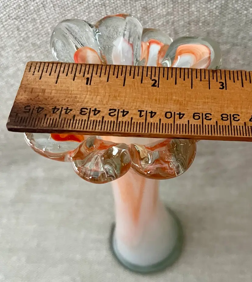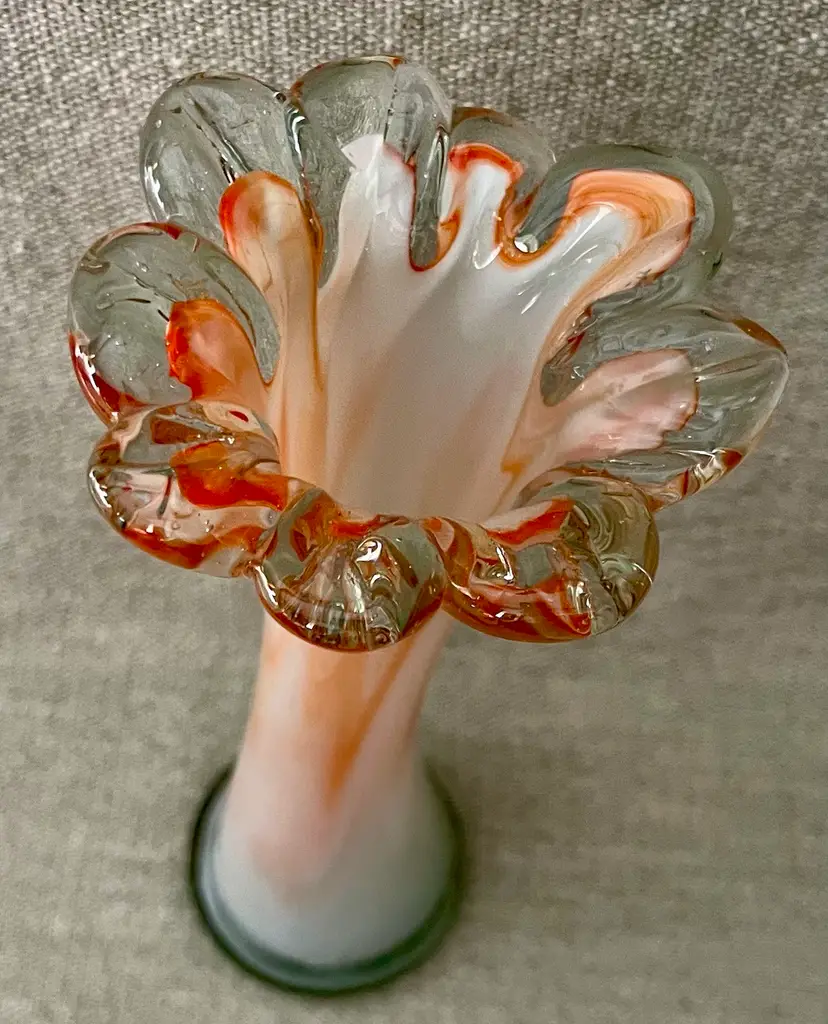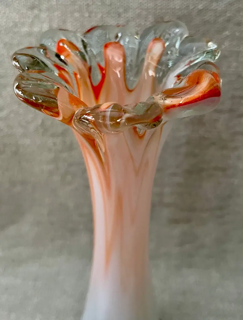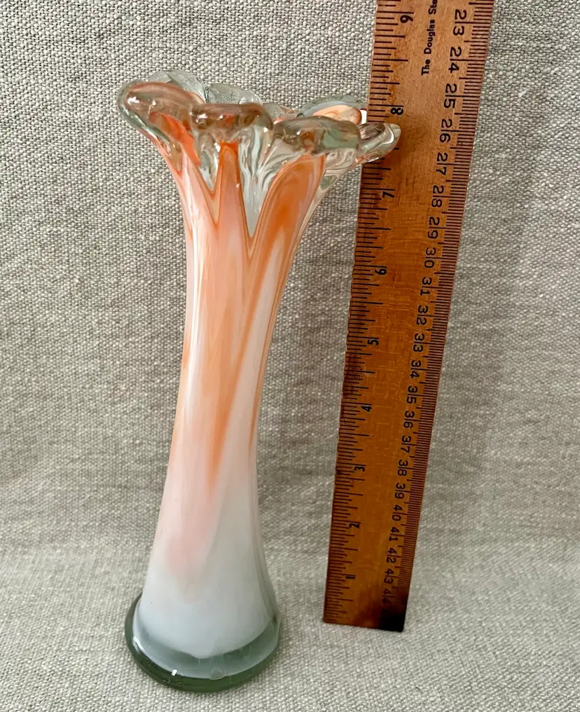 This vintage hand-blown art glass vase features a unique design with a 9-finger scalloped edge and a glossy finish, typical of Mid-Century Modern style. This abstract piece showcases vibrant colors of orange and cream with a hint of clear glass. Handmade and unmarked, this vase stands at 8 inches tall with a base width of approximately 2.5 inches and a rim width of approximately 3 inches and a slightly leaning tilt. It is a one-of-a-kind decorative item that adds a touch of retro charm to any space, perfect for collectors of vintage glassware.