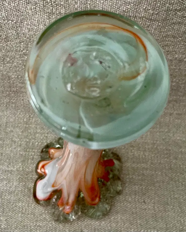 Please look at all the photos prior to deciding to make a purchase. This is a gently used / pre-owned item. And, VINTAGE (20 years +) is seldom perfect. It tilts as seen in the photos; has a rough Pontil marking on its underside which may be contributing to the tilt. Buyer is strongly encouraged to review the photos and decide for themselves its condition as my interpretation may not align with yours. Prior to a purchase, questions not answered in photos, details, description are welcome.