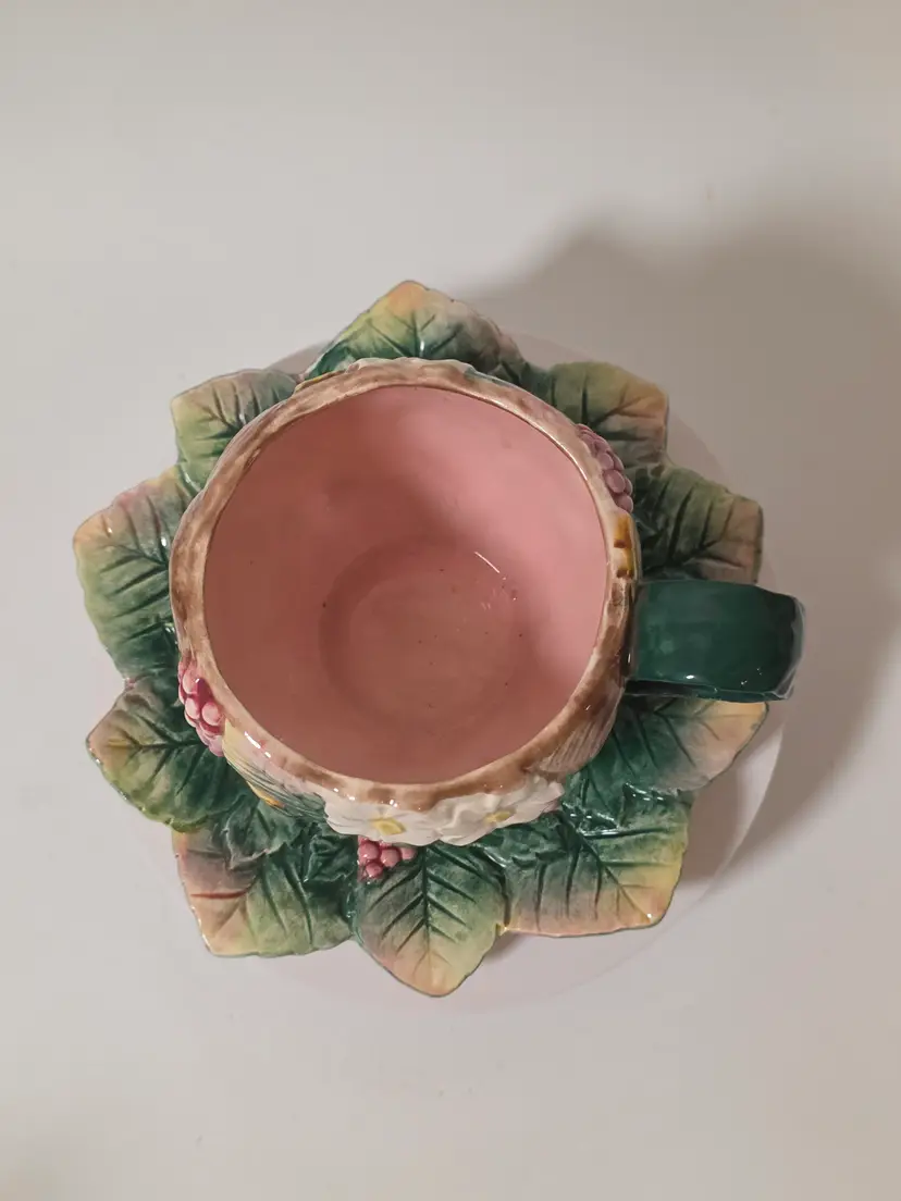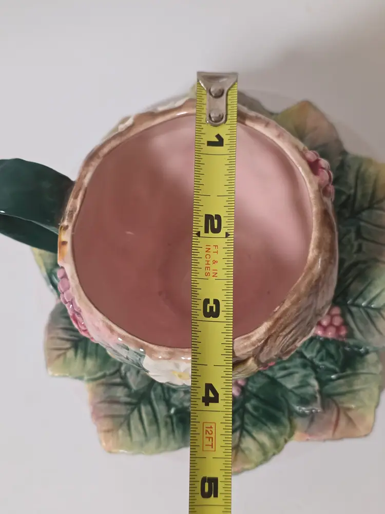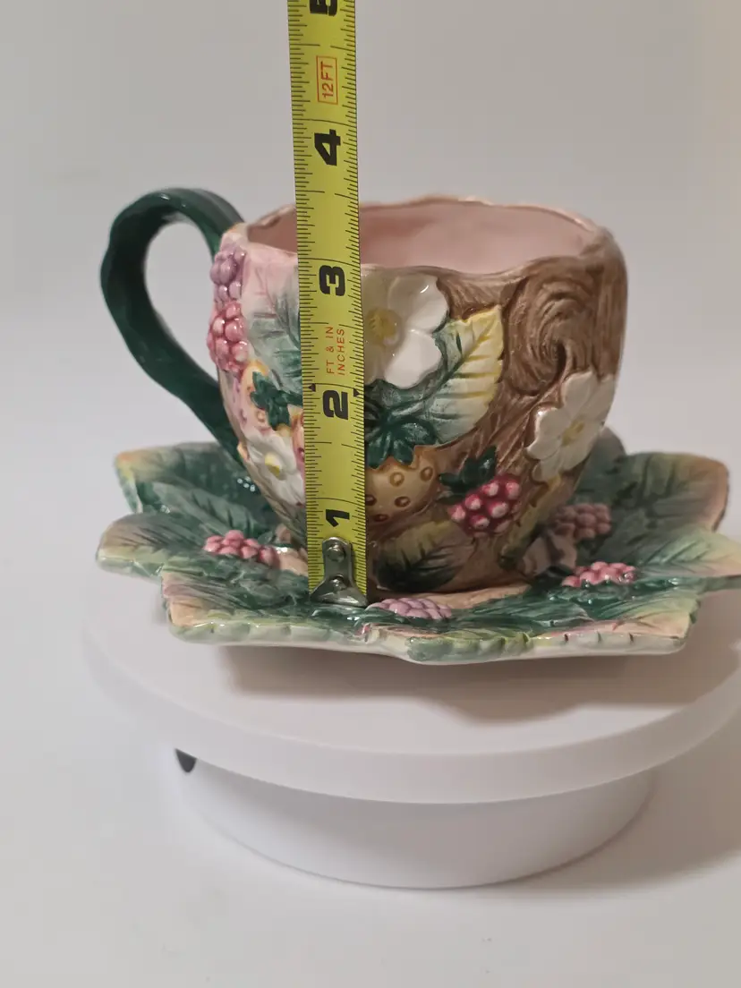 This vintage Fitz and Floyd teacup and saucer set from 1991 features a charming Botanic Garden pattern with floral designs and strawberries, perfect for various occasions such as Easter, Christmas, birthday, or just as a thoughtful gift. Made of ceramic with decorative features, this two-piece set adds a touch of whimsy to tea time. The colorful design and vintage appeal make it a unique and collectible piece for any tea enthusiast or collector.