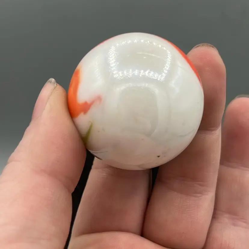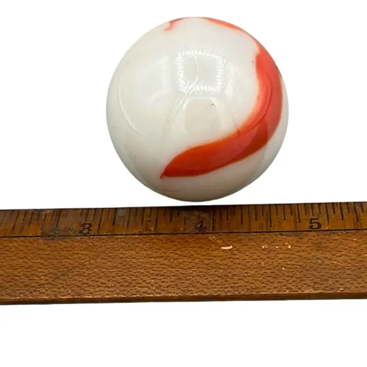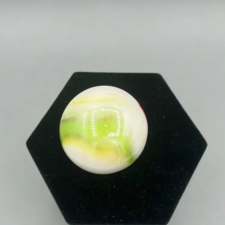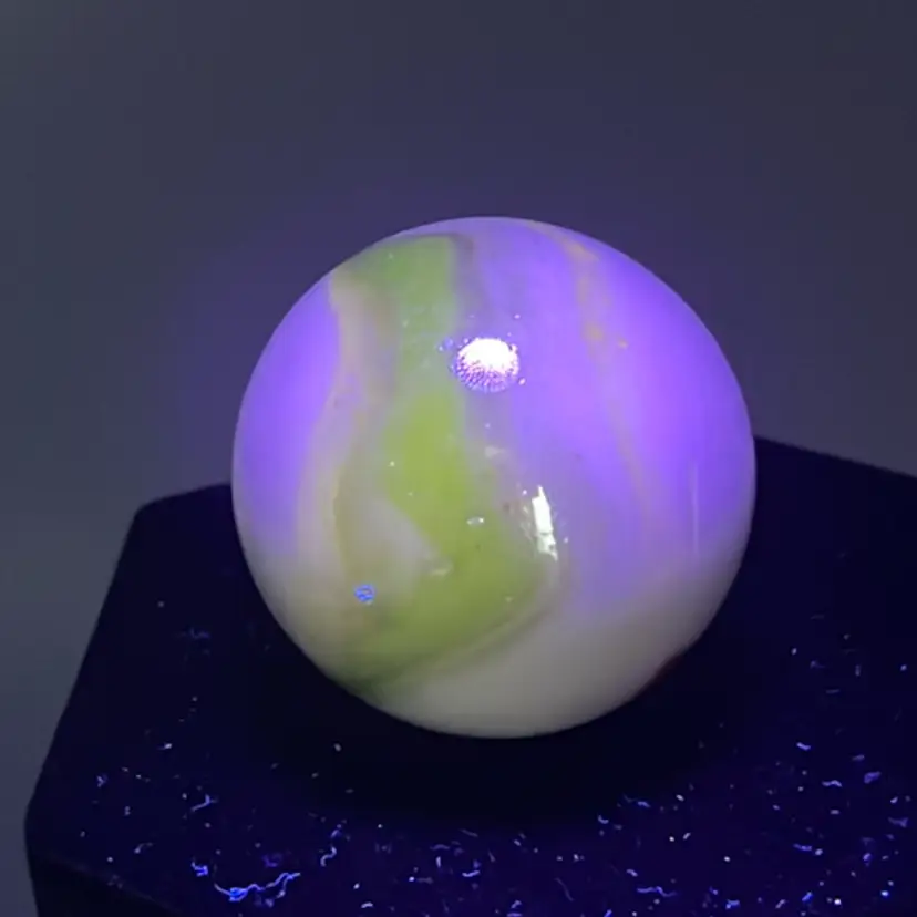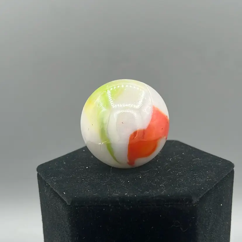 Potential Peltier? Art glass marble with red and green ribbons on a white background. There is an iridescent sheen as well. There is minor pitting. Has orange lines glowing under UV Black light.