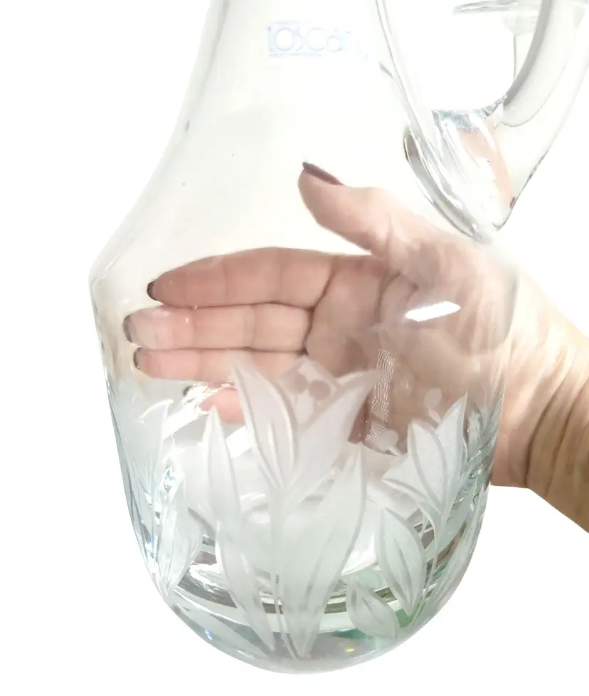 This mid-century decanter and glass set by Toscany exudes elegance with its etched tulip design and handcrafted crystal. A timeless addition for collectors.