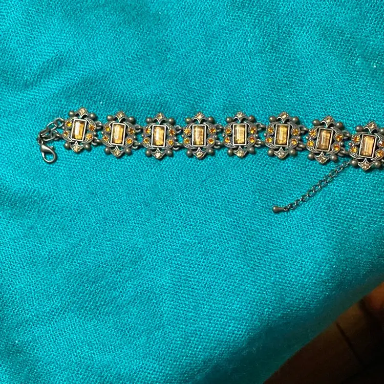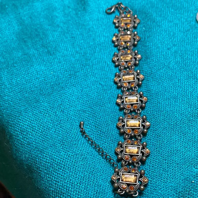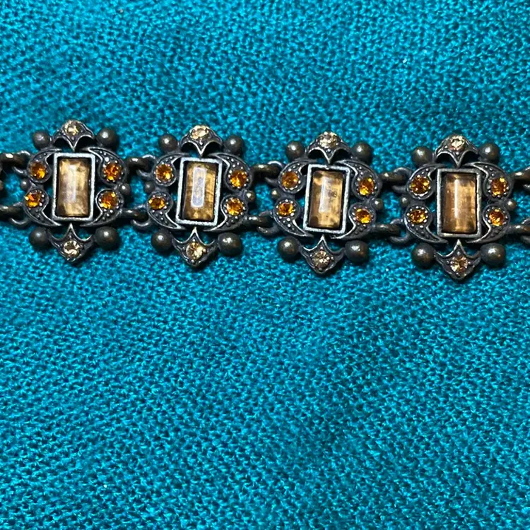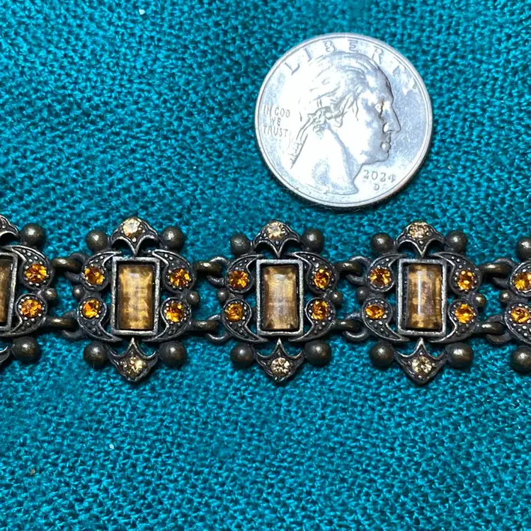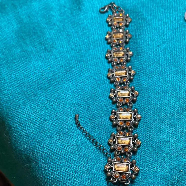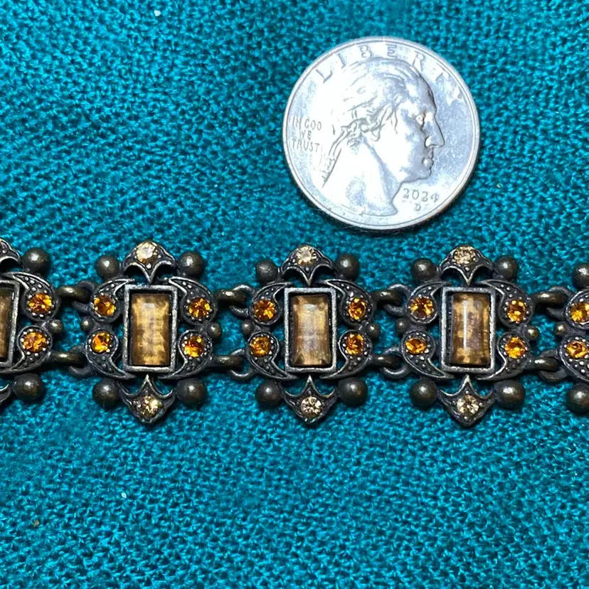 This mid century costume jewelry bracelet offers amber and citrine colored rhinestones. Eight panels total w/ a lobster closure and 1.5 inch extension gives it total length of 9.25.