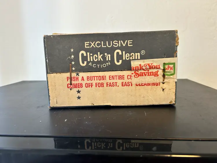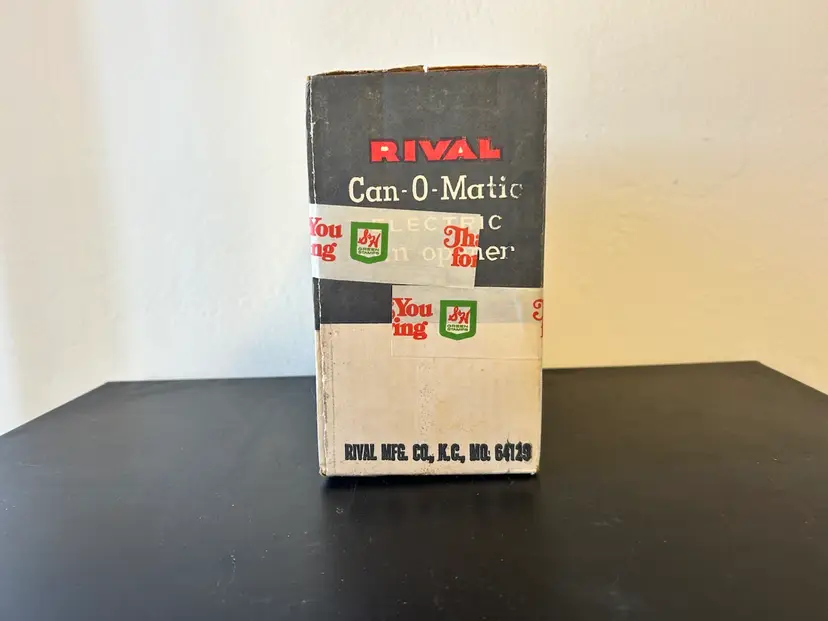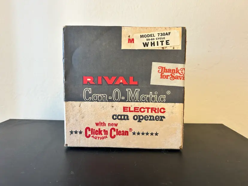 Vtg Rival Can-O-Matic Click n Clean Electric Can Opener In original box. Factory sealed. Never opened. Never used. Has S&H Stamp Tape. Model 730AF White Please see photos. Let me know if you have any questions. Thank you for stopping by.