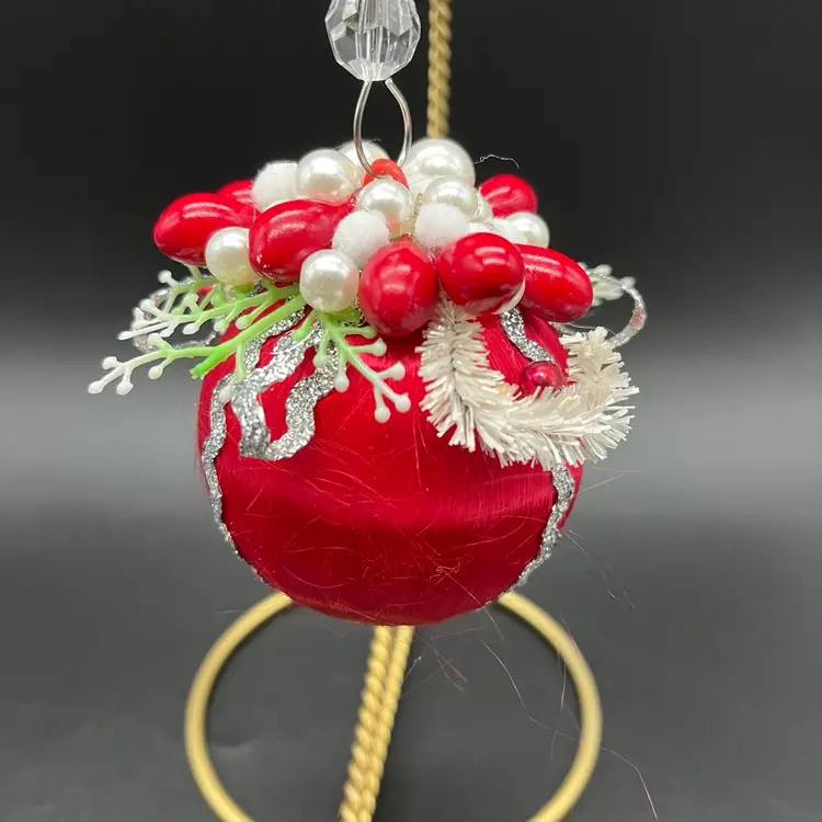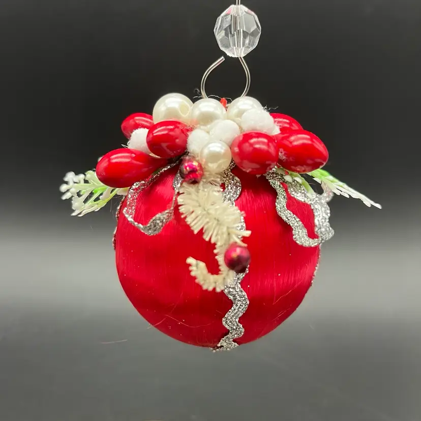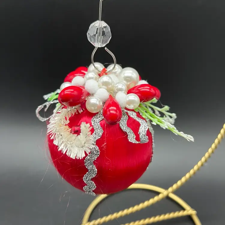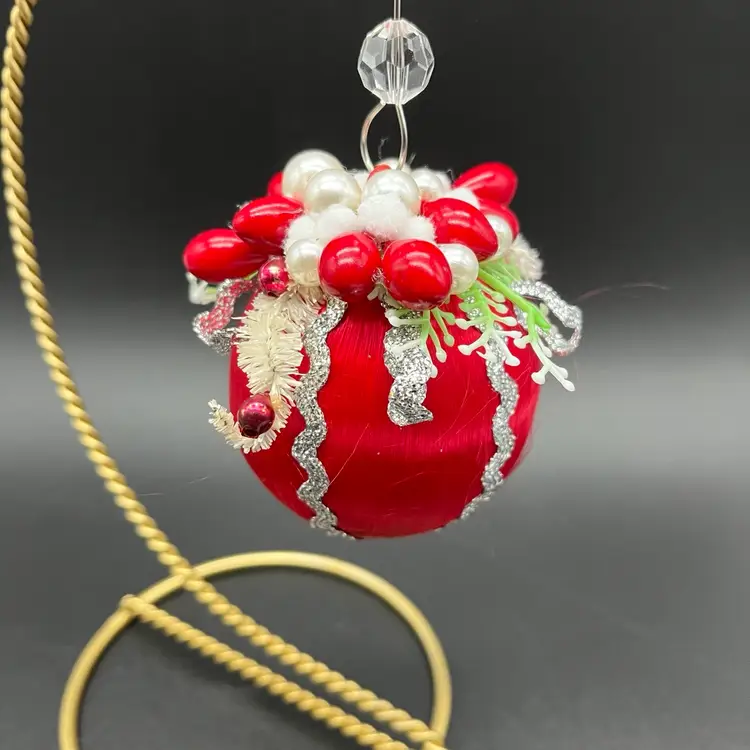 I took a vintage satin ornament, adorned it with many vintage goodies including berries, bottle brush, and others items. Trim is from an estate sale as well