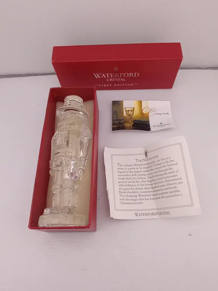 This is a stunning Waterford crystal nutcracker paperweight, first edition. It comes in the orginal box with the original paperwork. It's in excellent condition with no note flaws.
