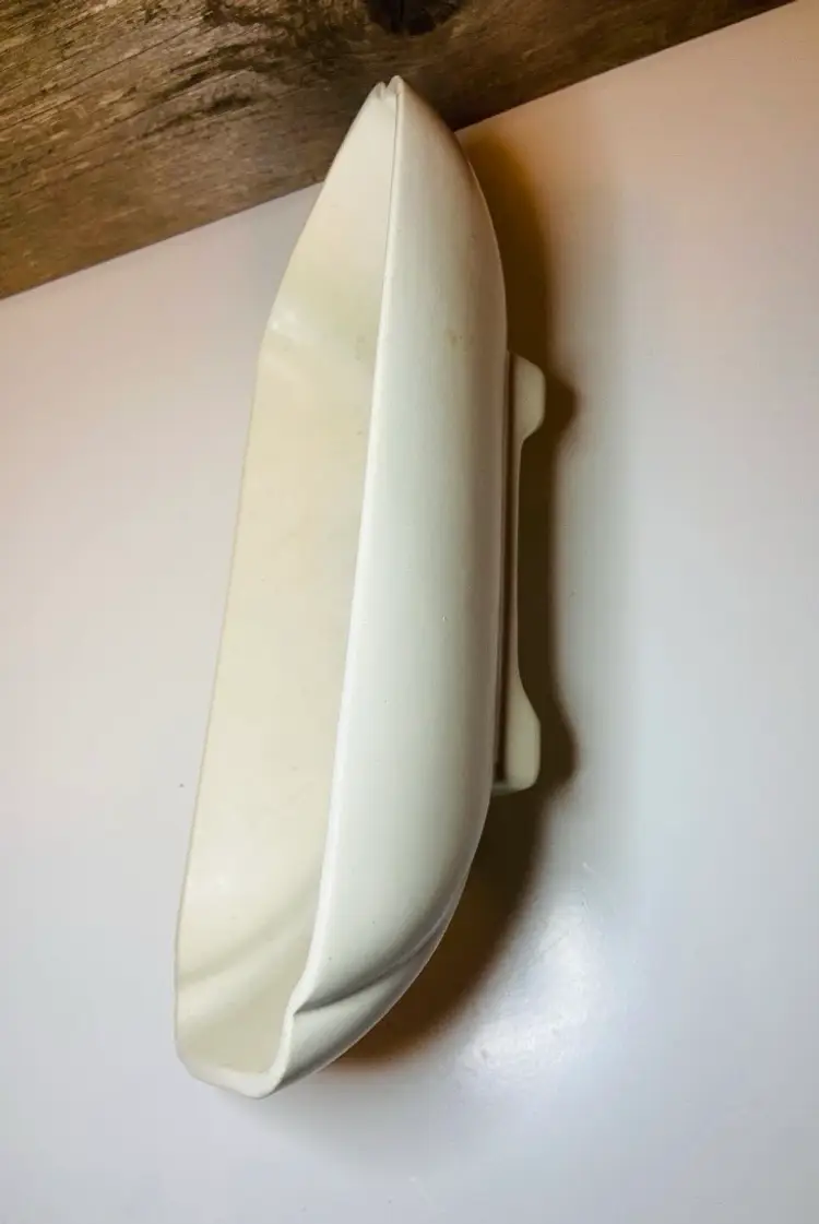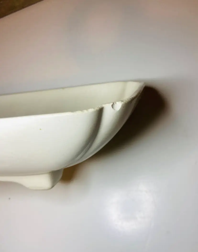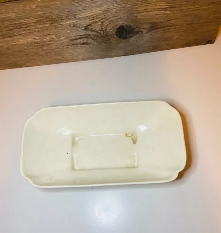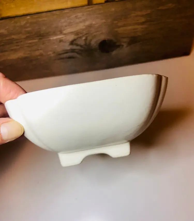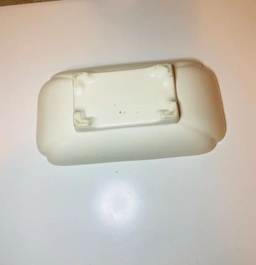 This footed bowl is a great centerpiece or decor bowl. It’s rectangular shape, the detail on the edges and the feet are the best. There is a chip on the corner and a small flea bite. Otherwise in good used condition.