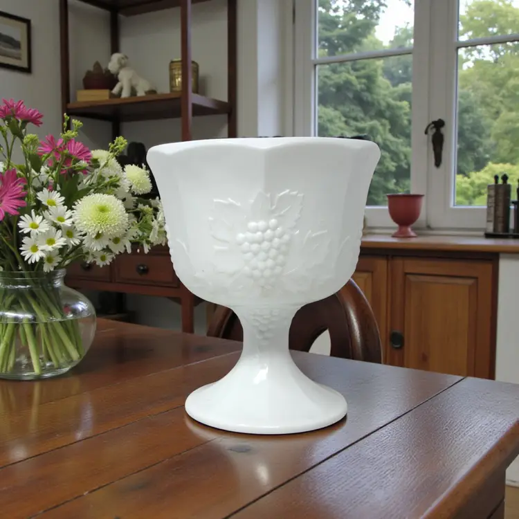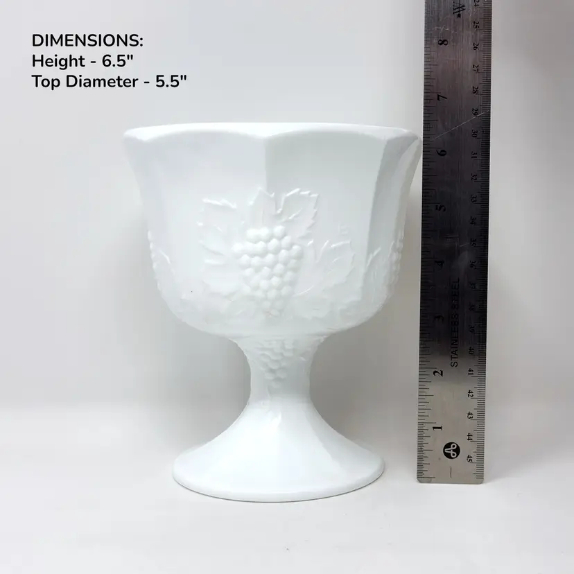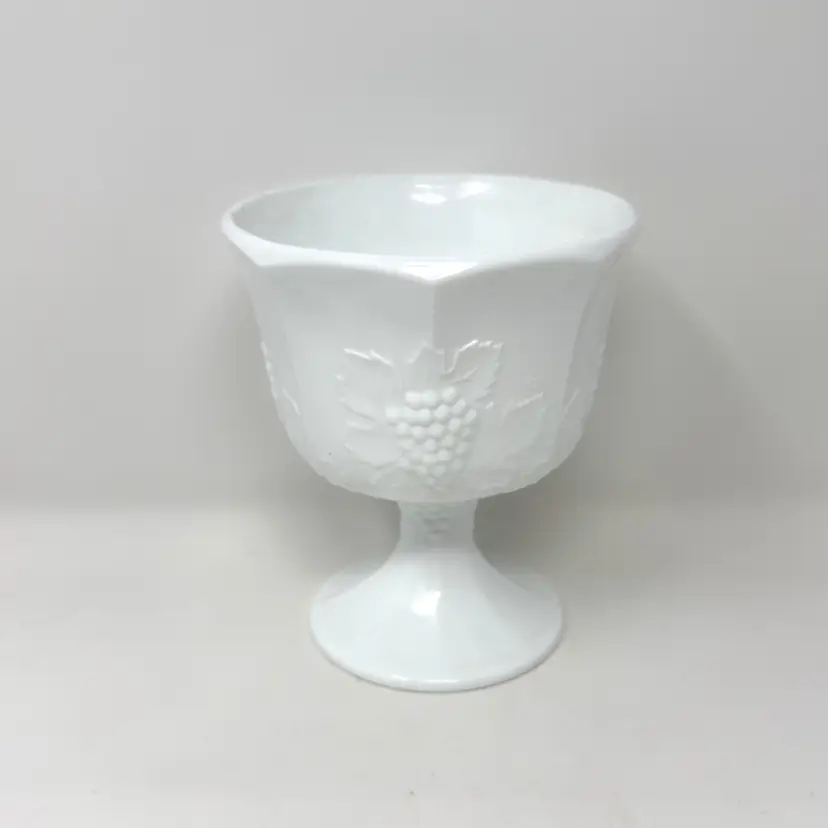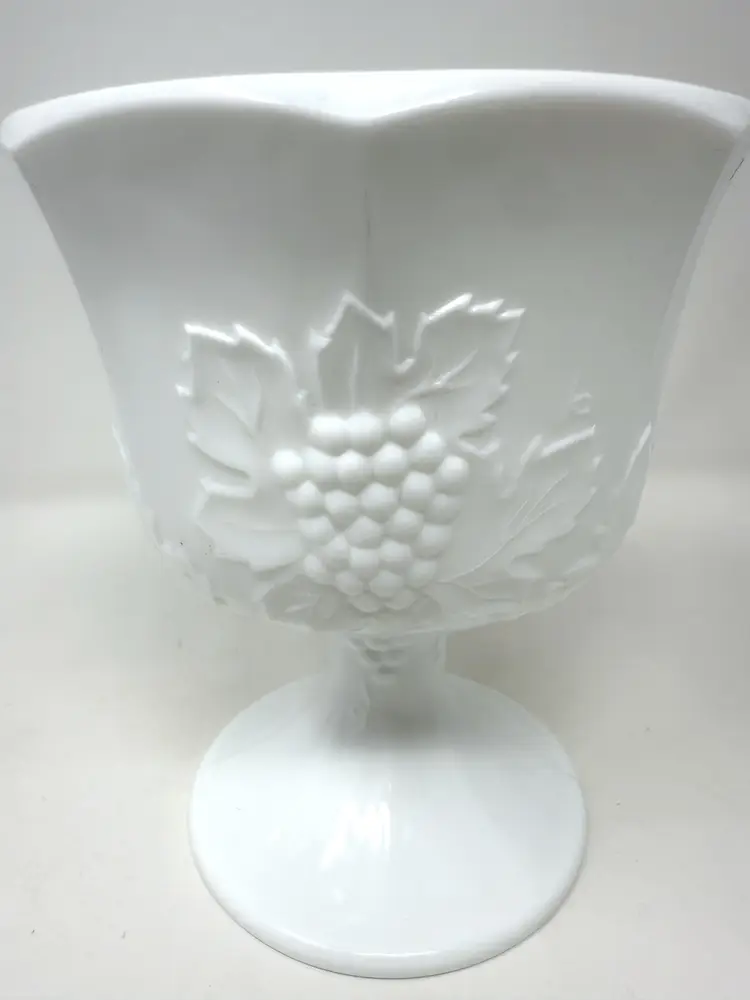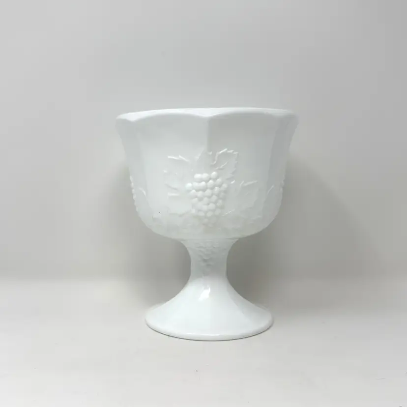 Classic white milk glass compote with embossed grape design. A timeless Indiana Glass piece for cottagecore charm or elegant vintage display.
