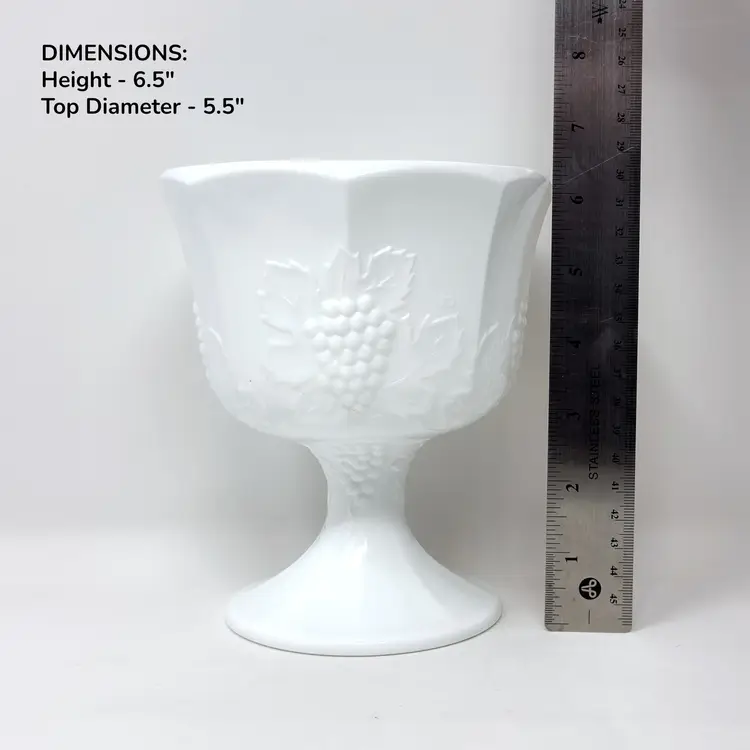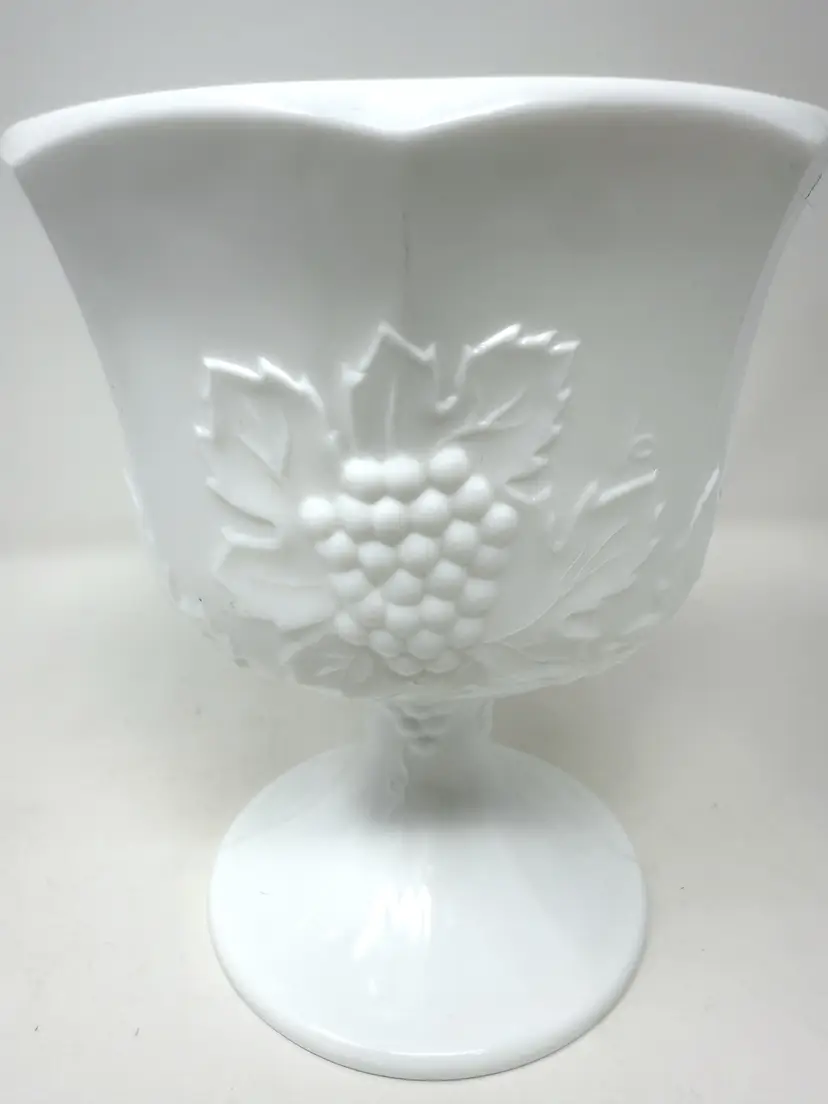 Details: • Manufacturer: Indiana Glass, USA • Markings: Unmarked (typical of this pattern) • Date/Era: Circa 1950s–1960s • Design Style: Traditional, Cottagecore, Vintage • Pattern: Harvest or Colony Grape embossed • Color: White • Material: Pressed milk glass • Shape: Footed bowl with scalloped edge