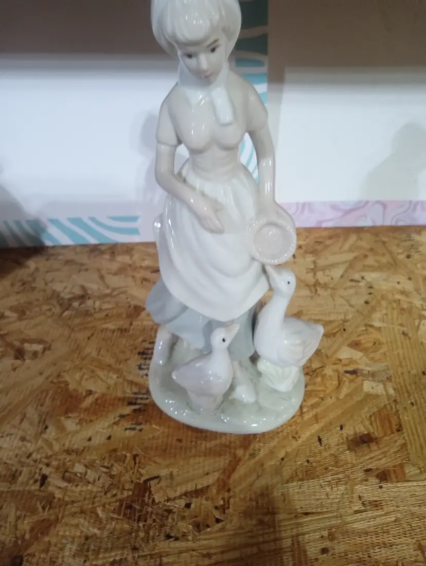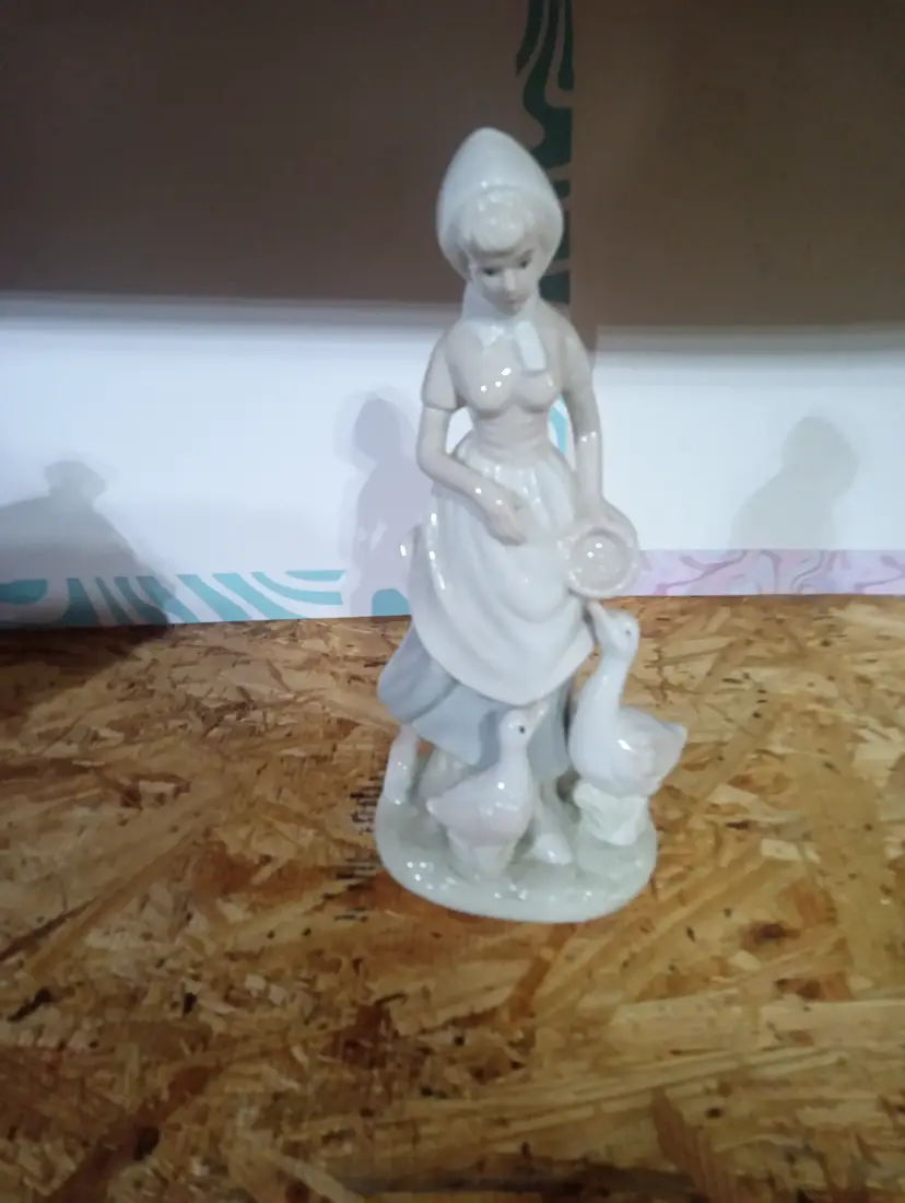 Charming white porcelain figurine featuring a young girl interacting with geese in a gentle pastoral scene. Beautiful sculpted details and soft tones make this a lovely collectible or farmhouse-style décor piece.